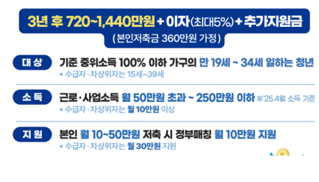 - 지원내용 : 본인 저축액(월 10만 원) 대비 1:1 정부매칭 지원 (단, 수급자·차상위 청년은 1:3 정부매칭 지원)